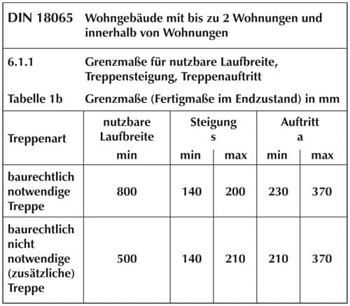Die Schrittlänge verkürzt sich beim Treppensteigen um das 2-fache der Höhe. Wenn man 10 cm hochsteigt, beträgt die horizontale Schrittlänge nur noch 43 cm (bei 18 cm noch 27 cm). Dadurch ergibt sich ein empfehlenswertes Steigungsverhältnis 18/27 cm für Treppen.